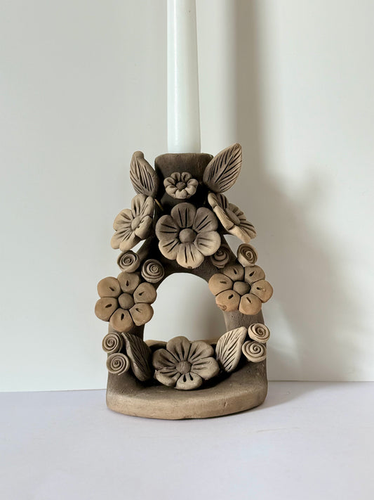 Handmade Clay Floral Candleholder - Smoked