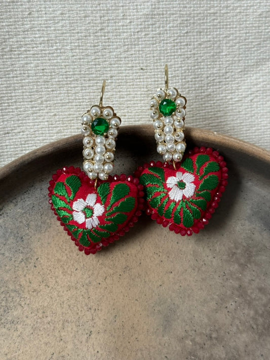Hand Embroidered Heart Shaped Red/White/Green Earrings