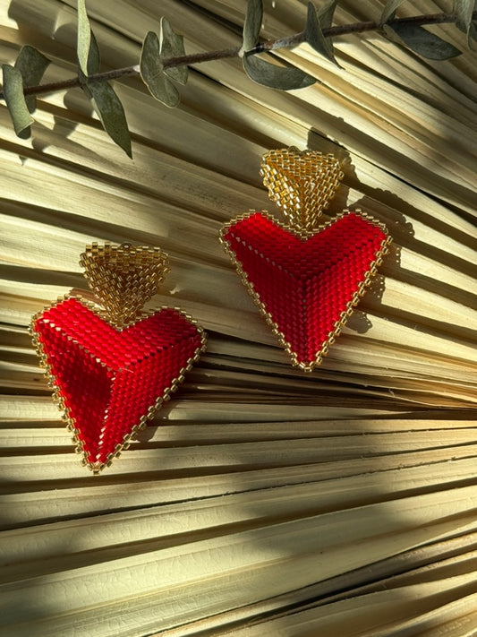 Hand Embroidered Heart Shaped Earrings - Red/Yellow