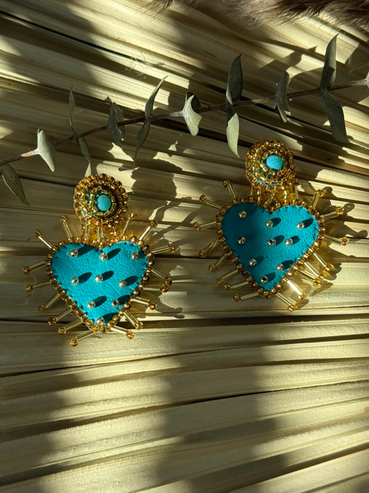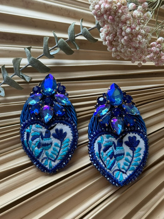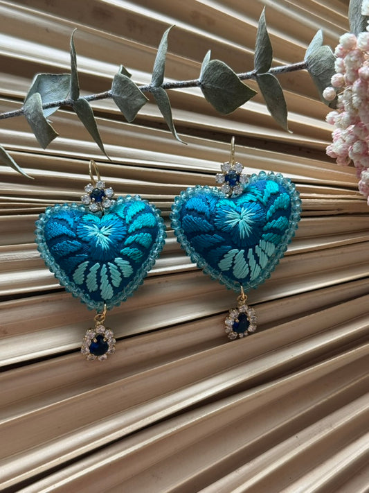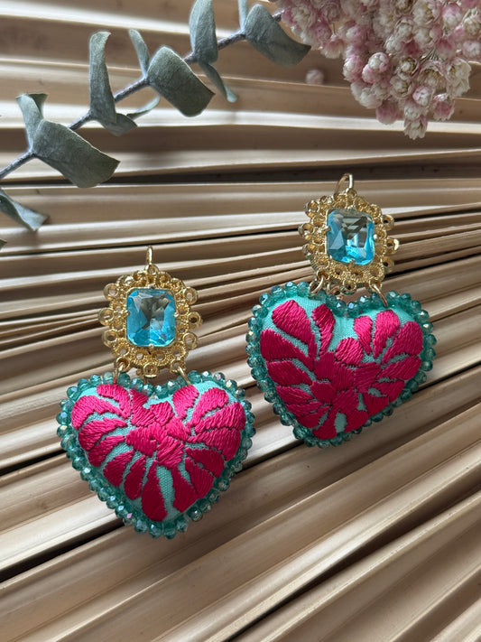 Hand Embroidered Heart Shaped Earrings - Caribbean Blue/Magenta