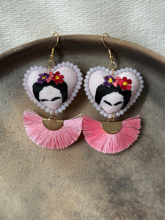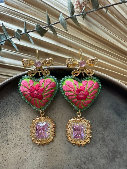 Hand Embroidered Heart Shaped Earrings - Pink/Green