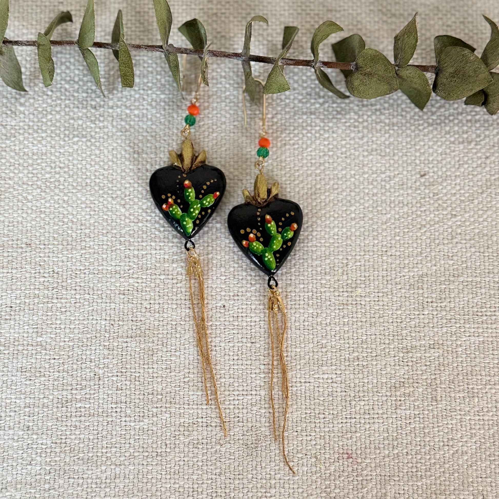 Handmade in Guanajuato, Mexico, these long Sacred Heart earrings feature a bold black finish with hand-painted cactus details. Crafted from lightweight papier-mâché, each piece is a unique blend of Mexican folk art and modern style. Symbolizing strength, growth and devotion, they’re a striking way to wear culture with heart.