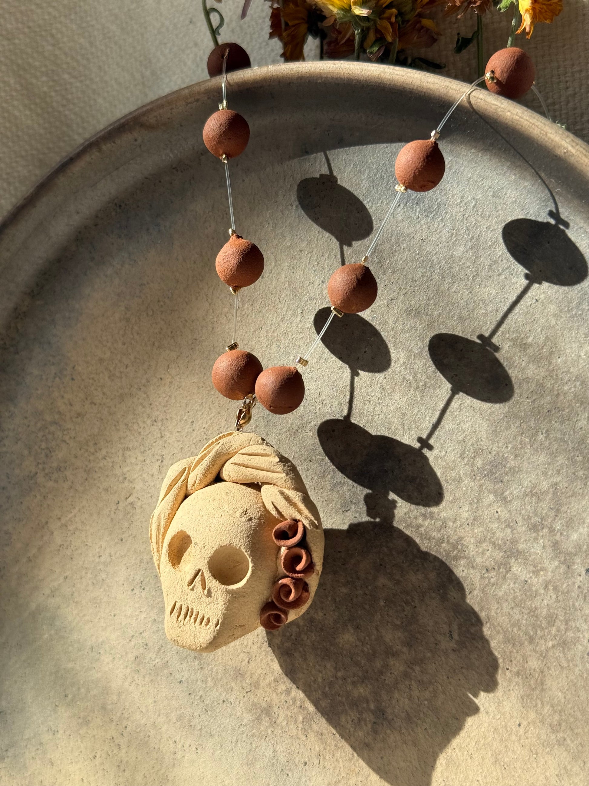 This handmade clay beaded Catrina necklace is a stunning tribute to Mexican folk art and craftsmanship. Featuring a beautifully detailed Catrina pendant (1.5 inches in length) and colorful clay beads. The necklace is crafted with a clear, fine thread that blends seamlessly against the skin, allowing the design and details of the necklace to shine creating the illusion of floating beads when worn.