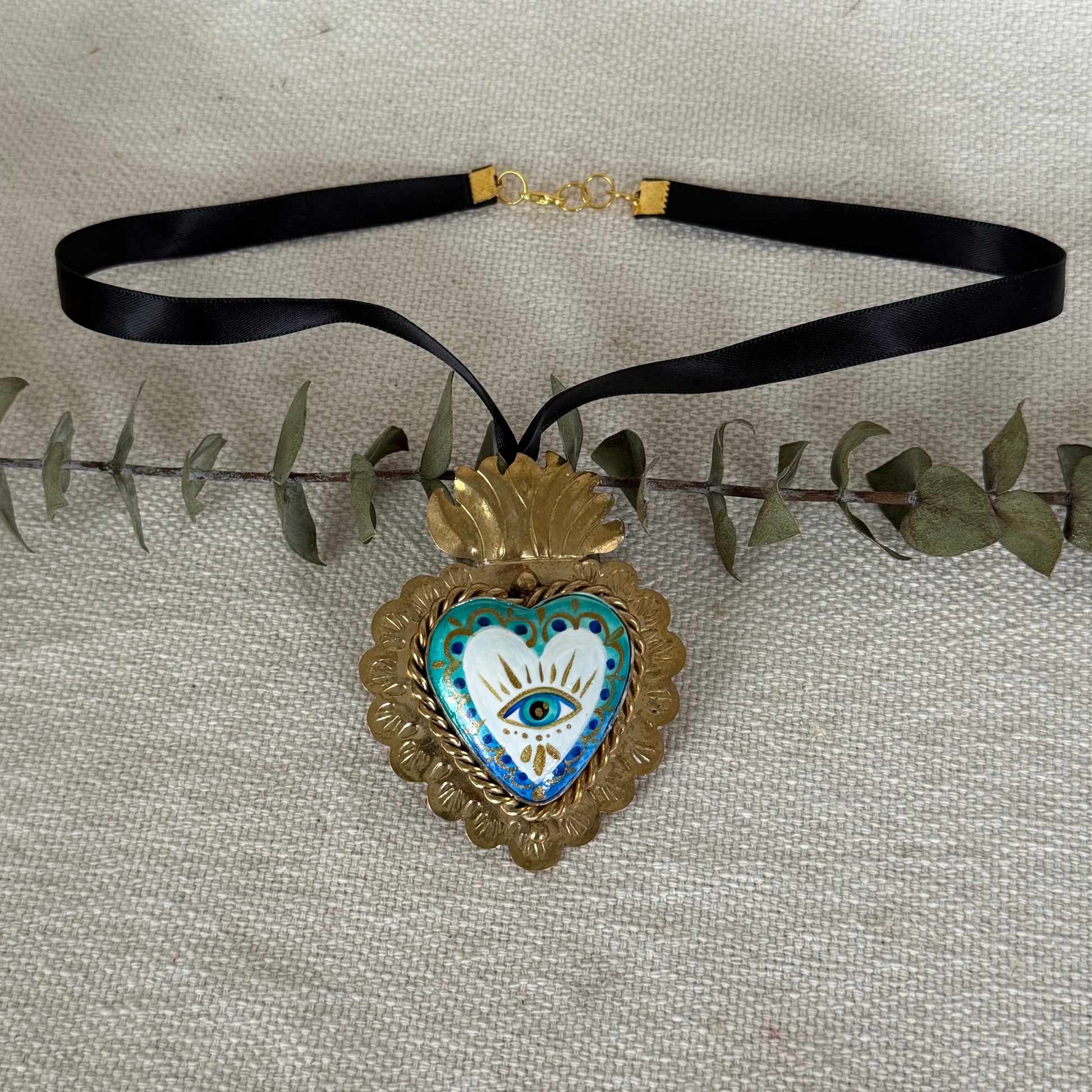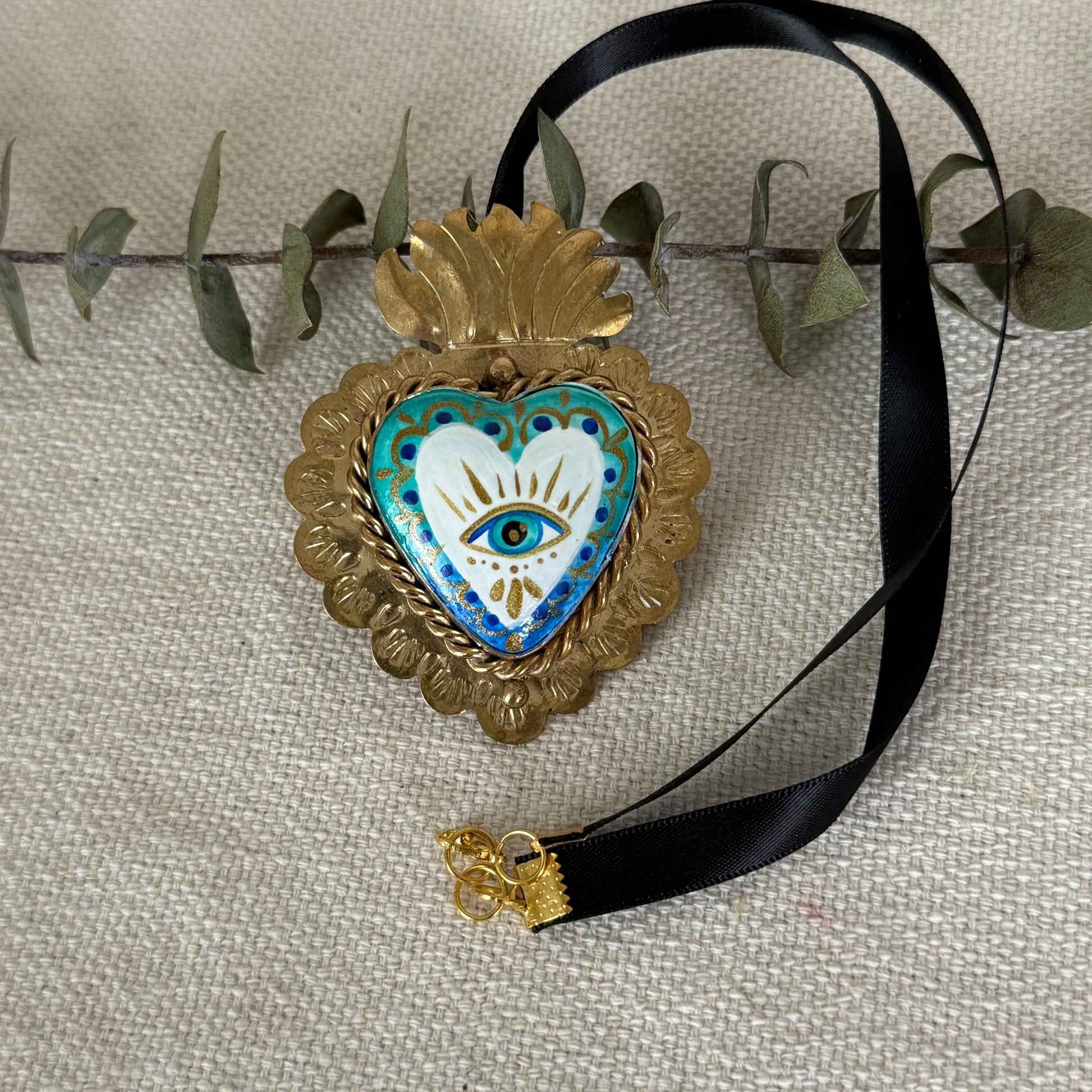 Fierce protection meets bold tradition in this stunning sacred heart shaped pendant featuring a striking white/blue finish and hand painted Evil Eye design. Made from papier-mâché over a copper base and satin ribbon, this piece blends Mexican folk art with deep symbolism. A statement necklace that brings color, culture, and meaning to any look. Made in Guanajuato, Mexico.