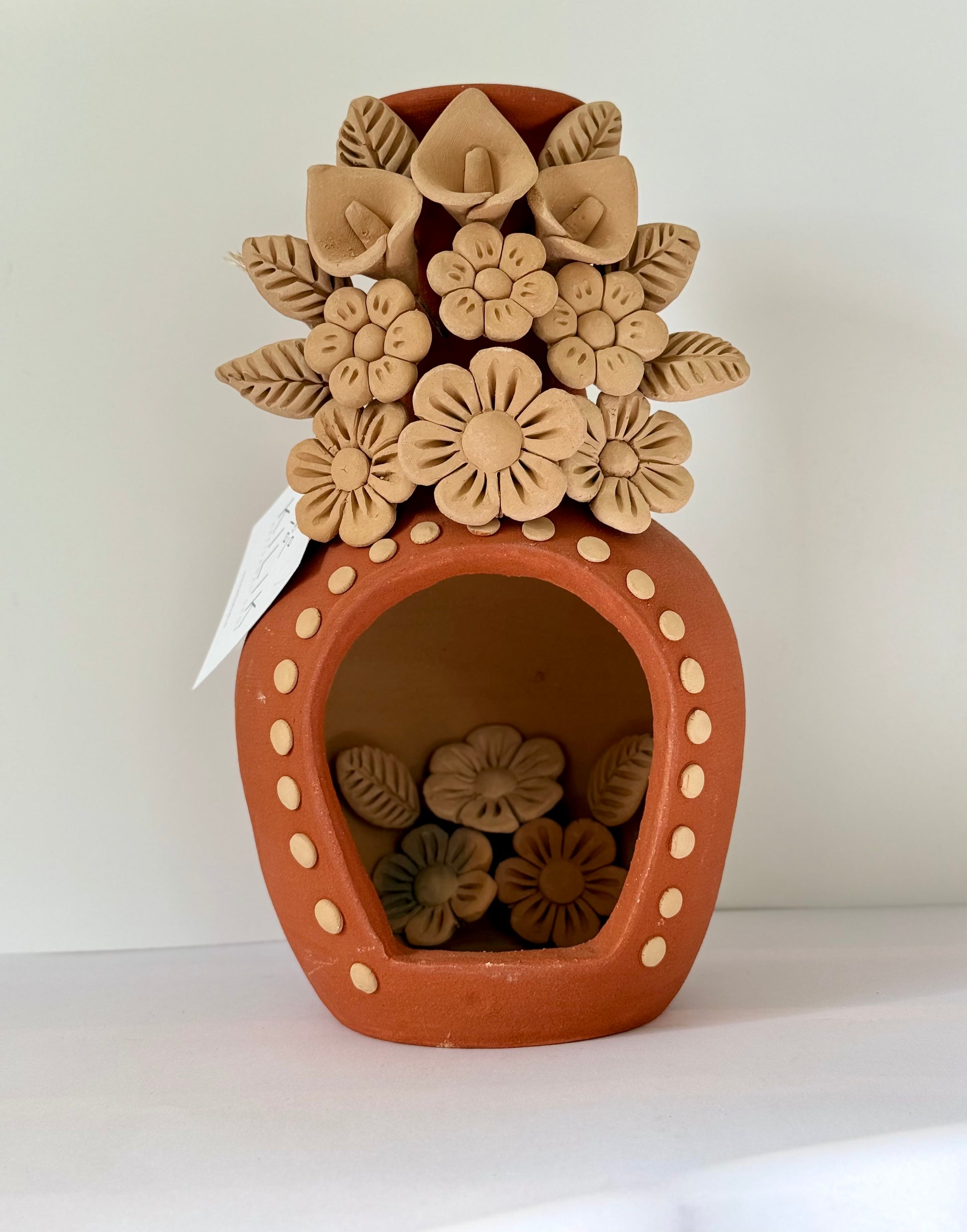 Infuse your space with warmth and artisanal charm with this beautifully handcrafted clay chimney candle holder. Inspired by traditional Mexican chimeneas, this version is made entirely by hand using 2 techniques and adorned with intricate 3D clay flowers. Each petal carefully sculpted to bring delicate texture and life to the piece.