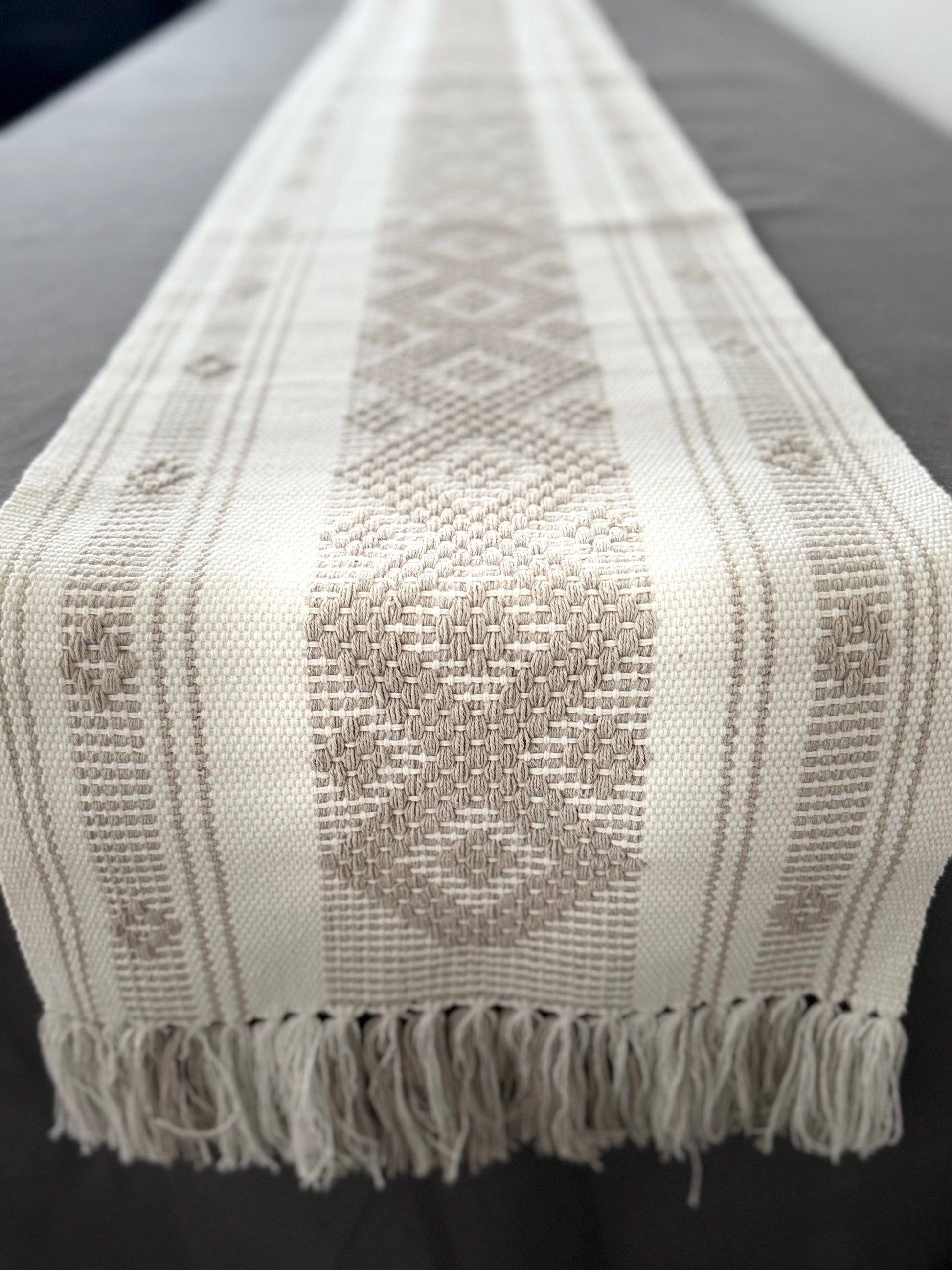 Handwoven Backstrap Loom Table Runner – White & Cream