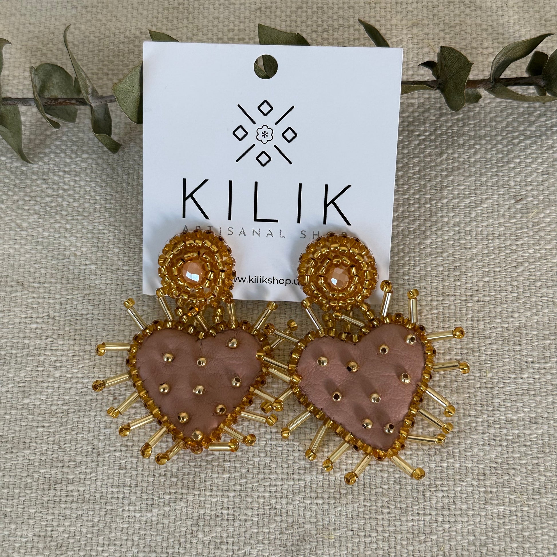 Made in Bogotá, Colombia, these earrings are sure to be a conversation starter. Meticulously handcrafted with care out of colored leather and gold beads, each pair highlights the intricate craftsmanship and cultural artistry of Colombian artisans.
