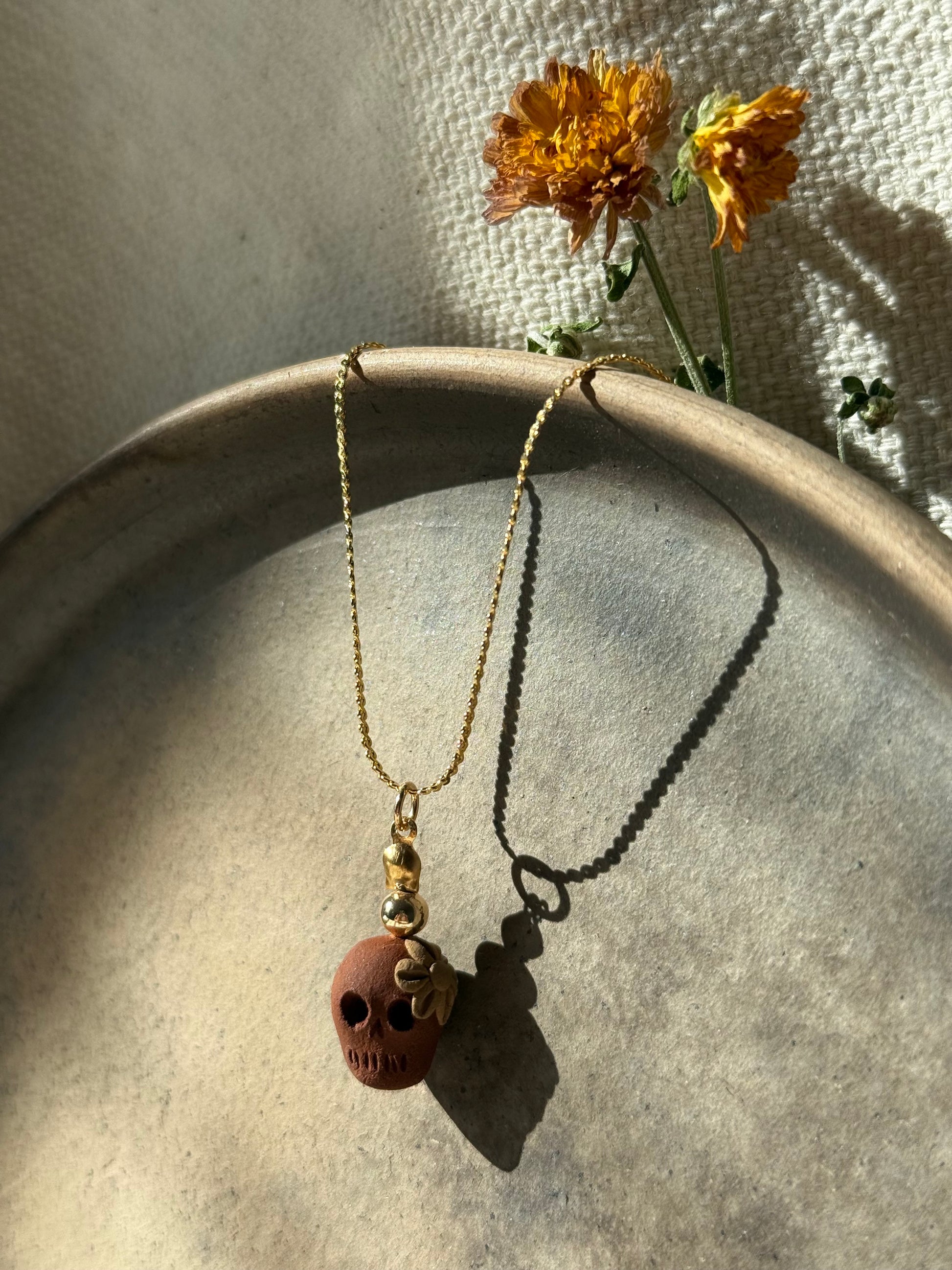 Add a subtle touch of tradition with this minimalistic clay Catrina necklace, designed for effortless, everyday wear. Measuring approximately 1.5 inches in length, the pendant is lightweight and comfortable, yet rich in cultural symbolism.