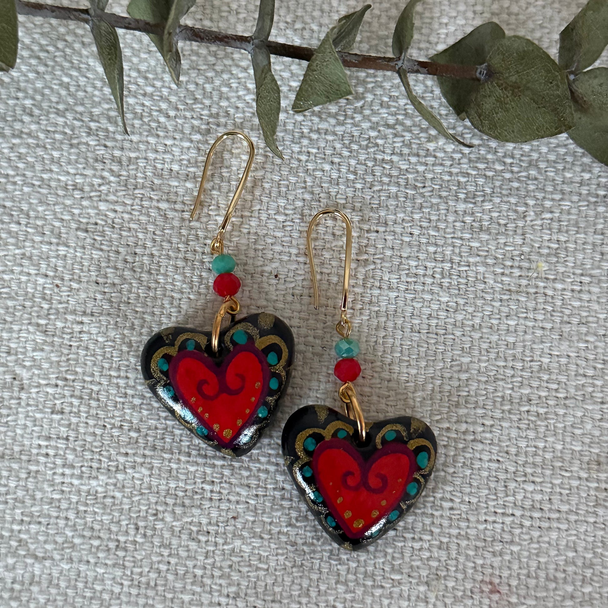 Bold, bright, and full of love these hand-painted red heart-shaped earrings are crafted from lightweight papier-mâché. Their classic shape and vibrant color add an instant pop to any outfit, taking you effortlessly from day to night with a touch of handmade charm.