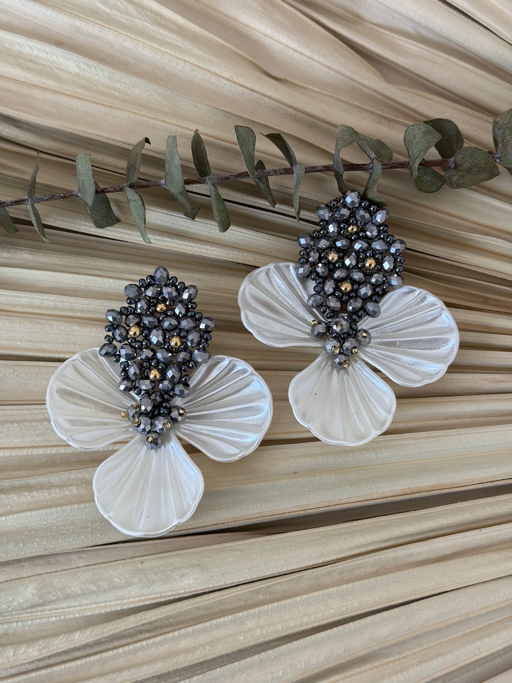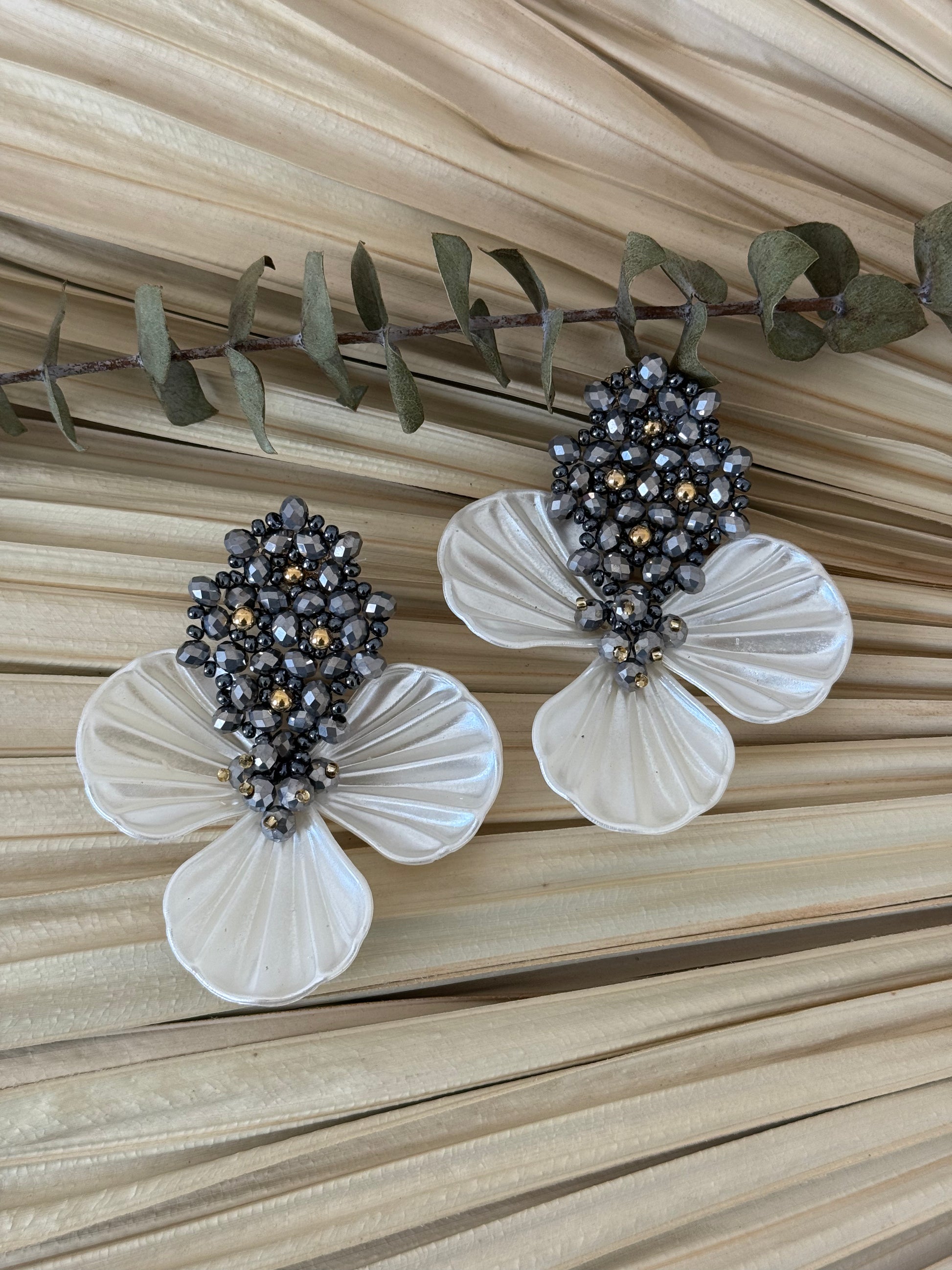 Seashell-style petals adorn these striking beaded earrings, blending tones of soft grey, metallic charcoal, and subtle hints of gold. At 3.25" long by 2.75" wide, they bring bold elegance with an ocean-inspired twist. Sculptural and shimmering, they're a stunning fusion of natural form and statement style.
